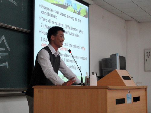 其次,上台发言的是06级的陈若浩校友。他与大家分享了自己的亲身求职经历,认为我们应该尽量放大自己的优点,让自己足以引起别人的注意,并努力地在别人面前展现出最好的自己。一言以蔽之,就是我们要有意识地去学会营销自己。