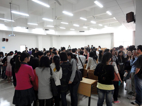 交流会的最后环节是进行分组讨论。05、06级的校友代表分别分成了教师组、考研组和企业上班组,每个同学可以根据自己的实际情况向他们咨询。分组讨论掀起了交流会的最高潮,每位校友嘉宾都被热情的07级学子重重包围起来,现场气氛十分热烈。