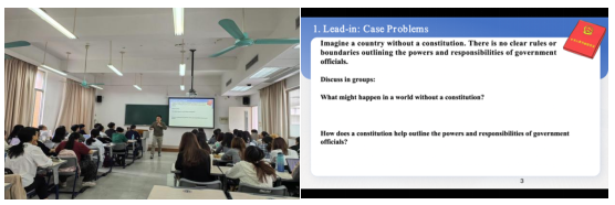 华老师首先以“一个国家没有宪法会怎样”和“宪法如何明确政府官员的权利与职责”这两个启发式问题引入,组织学生开展小组讨论并邀请代表分享观点,进而自然引出美国宪法的基本概念与重要性。